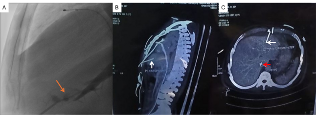 As lead-induced RV perforation causing tamponade was suspected, echocardiography-guided bedside pericardiocentesis was attempted via a 6F sheath. However, there was no hemodynamic improvement despite aspiration and autotransfusion. Contrast injection into the sheath showed opacification of a hepatic vein with trauma to the small branches (Figure A; Video). Another sheath was inserted under fluoroscopic guidance, through which 200 mL of hemorrhagic fluid was aspirated via pigtail (after confirming position with contrast) with hemodynamic improvement. The cardiothoracic surgery team advised computed tomography of the chest and abdomen, which showed the ectopic sheath lying in the hepatic parenchyma (Figure B and C). We switched to single antiplatelet with repeated pigtail drainage and output reducing over next 2 days. Under surgical backup, the ectopic sheath was removed with hourly abdominal girth and lactate monitoring. Subsequently, the temporary pacemaker lead was removed after 72 hours; the pigtail was removed 48 hours later. The patient was stable at discharge with no fluid re-accumulation.