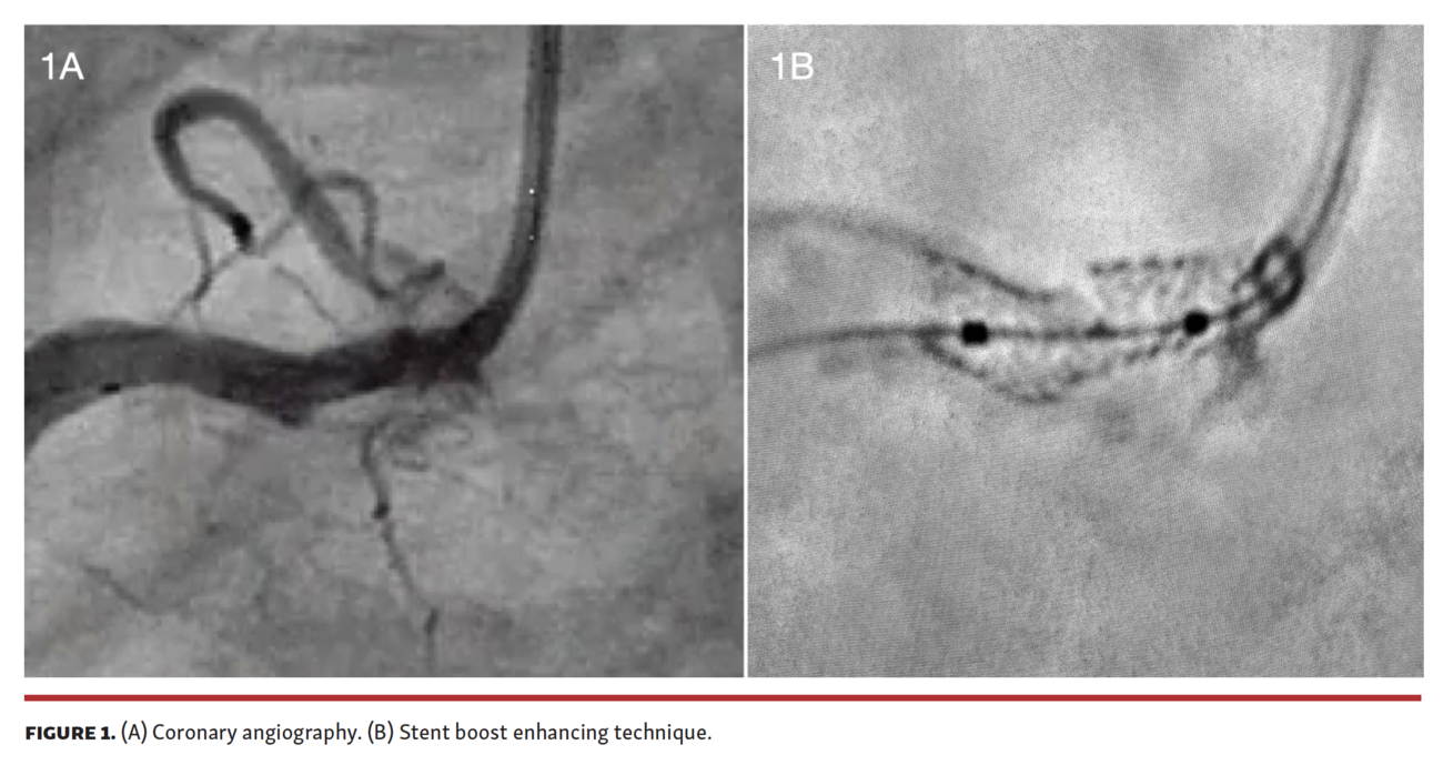 A 77-year-old male patient was admitted for non-ST segment elevation myocardial infarction (NSTEMI). Coronary angiography (CAG) showed diffusely narrowed left anterior descending and circumflex arteries, and a severely calcified ostial stenosis in the right coronary artery (RCA). After predilation, a 3.5 x 15 mm everolimus-eluting stent (Synergy Megatron, Boston Scientific) was deployed in the RCA, achieving optimal angiographic result, without complications.