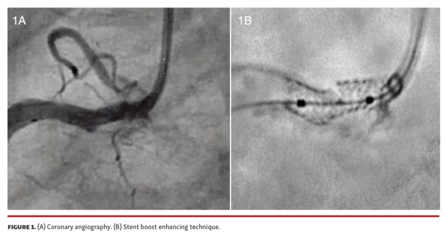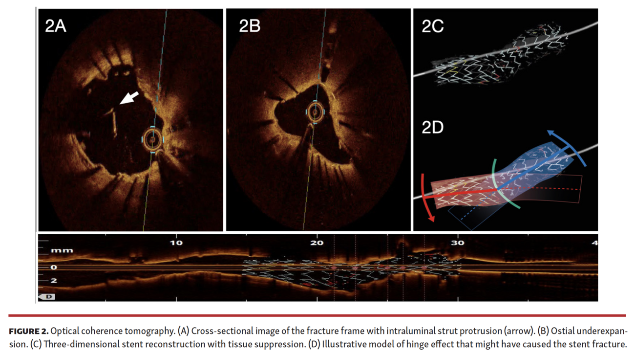 The Synergy Megatron stent confers enhanced axial and radial forces, which makes it an ideal choice for ostial and calcified lesions. However, in this case, the stent fractured. The mechanical stress due to severe calcification at the ostium, followed by a swinging segment, probably caused hinge effect and led to a stent fracture (Figure 2C). The fluoroscopy and stent-enhancing techniques suggest and could confirm the diagnosis, but intracoronary imaging is mandatory for anatomy characterization in order to decide treatment and optimize the result.
