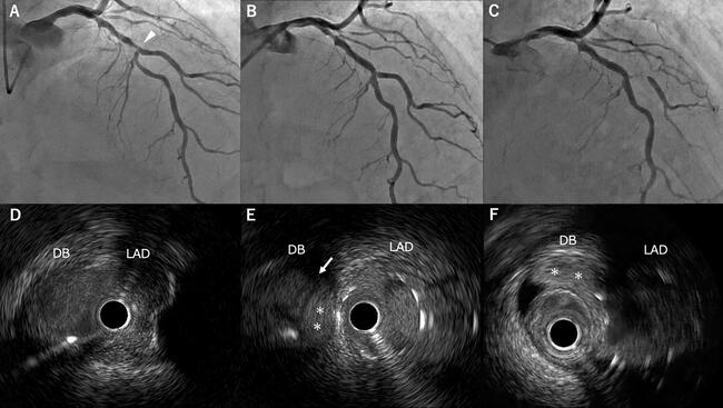 An 81-year-old man with prior myocardial infarction underwent follow-up coronary angiography, which showed severe mid-left anterior descending artery (LAD) stenosis with the first diagonal branch arising from the lesion (Figure A). Percutaneous coronary intervention was performed with diagonal branch protection. After predilatation and drug-eluting stent implantation, angiography showed Thrombolysis in Myocardial Infarction (TIMI)-3 flow (Figure B), but intravascular ultrasound (IVUS) revealed an intimal flap and small hematoma at the diagonal branch ostium (Figure E, Video 1). Shortly after transfer to recovery, the patient developed chest pain with ST-segment elevation. Emergent angiography demonstrated sub-occlusion of the diagonal branch (Figure C), and IVUS confirmed a large hematoma extending from the branch orifice (Figure F, Video 2). A drug-eluting stent was successfully deployed in the diagonal branch, restoring TIMI-3 flow.