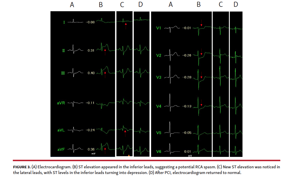 A 59-year-old man with a 95% stenosis in his diagonal branch (Figure 1) and no stenosis in the right coronary artery (RCA) or left circumflex artery was scheduled for percutaneous coronary intervention. A balloon angioplasty followed by a drug-coated balloon application achieved an acceptable result (Figure 2A, 2B). After prophylactic intravenous cefazolin administration for Proglide-site infection prevention, he started feeling general itching with palmar and cheek redness without any hemodynamic compromise, which resulted in methylprednisolone administration. However, ST elevation appeared in the inferior leads (Figure 3B), suggesting a potential RCA spasm. From these circumstances, a diagnosis of type I Kounis syndrome (KS) was made. Despite 2 puffs of nitroglycerin, the ST elevation persisted when bradycardia and hypotension progressed, and he became unconscious. While giving him intravenous epinephrine to maintain his hemodynamics, the ST level recovered, and he became fully conscious. When he complained of chest pain, a new ST elevation was noticed in the lateral leads, with ST levels in the inferior leads turning into depression (Figure 3C). Repeat angiography demonstrated neither spasm nor occlusion in the RCA (not shown), while the diagonal branch was completely occluded at the proximal portion (Figure 2C), which was considered to be responsible for ST elevation in the lateral leads. At that point, a diagnosis of type II KS was made. A drug-eluting stent implantation successfully restored blood flow (Figure 2D) and electrocardiographic changes returned to baseline (Figure 3D). Subsequently, his intradermal test was positive for cefazolin. This is the first reported case that combined 2 variants of KS in a single event.