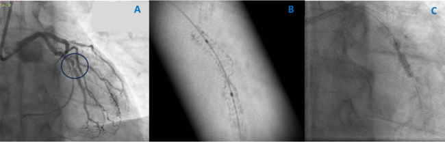 A 73-year-old man with known history of arterial hypertension and diabetes mellitus was referred to our hospital for coronary angiography because of unstable angina. A stent had been implanted in his first obtuse marginal branch (OM1) 5 months prior.