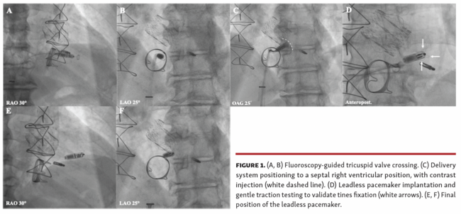 An 81-year-old patient with previous transcatheter aortic valve replacement, transcatheter mitral valve repair, and conventional biological tricuspid valve replacement presented with symptomatic complete atrioventricular block. Pacemaker implantation was performed under mild sedation, through a 27 Fr outer-diameter right femoral venous sheath. Fluoroscopy-guided tricuspid valve crossing (Video 1) was performed using the Micra Transcatheter Pacing System (Medtronic) (Figures 1A, 1B), with a right ventricular septal positioning (Figures 1C). After device fixation and traction testing (Figures 1D), the tether was cut and the delivery system was removed (Figures 1E, 1F). Postoperative pacemaker parameters were good and the patient had no pathological tricuspid valve regurgitation.