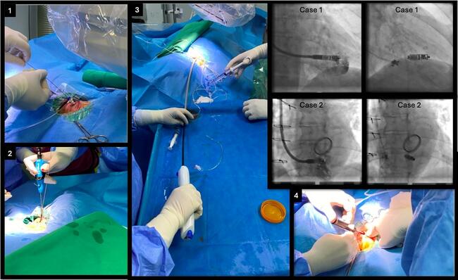 In both cases, the RIJ approach was deemed the only safe and feasible option. Procedures were performed under local anesthesia in the electrophysiology lab and were identical for both patients. Each was placed in the standard supine position with the C-arm rotated 90° leftward to allow right-neck access and facilitate manipulation of the Micra delivery system. Initial ultrasound confirmed a patent RIJ with a diameter greater than 1 cm. Ultrasound-guided puncture was performed, and a 6F sheath was inserted to secure access (Figure; panel 1). After placement of a 0.035-inch stiff guidewire, the sheath was removed, and 2 Perclose ProGlide sutures (Abbott) were deployed at 90° angles using the double preclose technique (Figure; panel 2). A 9F sheath was then inserted for superior vena cava venography, which confirmed unobstructed flow to the right atrium. Serial dilatation (14F to 18F) was performed, allowing safe advancement of the 27F Micra introducer sheath (Figure; panel 3). To minimize tip force, the Micra delivery system was advanced in a flexed configuration across the tricuspid valve. Under biplane fluoroscopy (RAO/LAO 45°), mid-septal positioning was confirmed (Figure; superimposed panels). Device deployment followed satisfactory electrical measurements. Fixation was confirmed by a pull-and-hold test, with at least 2 of 4 tines engaged. The tether was then cut, and the delivery system along with the sheath was withdrawn. Hemostasis was achieved using the pre-placed sutures (Figure; panel 4). The fluoroscopy times were 9.06 and 5.05 minutes with low radiation doses (air kerma: 134 mGy and 100 mGy) for each case, respectively. Both patients were mobilized immediately. No puncture site-related complications were seen.