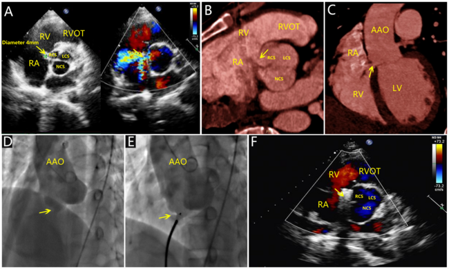 A 31-year-old man presented to our cardiac center with progressive dyspnea and fatigue. Physical examination revealed a continuous 3/6 systolic murmur at the lower left sternal border. Electrocardiography showed sinus tachycardia, while routine laboratory tests were normal. Transthoracic echocardiography (TTE) identified a 4-mm echo-free structure extending from the right coronary sinus into the right atrium. Color Doppler demonstrated a high velocity left-to-right shunt with peak velocity of 6.2 m/s and pressure gradient of 155 mm Hg, suggestive of aorto-right atrial fistula (Figure A). Contrast-enhanced computed tomography (CT) confirmed a ruptured right sinus of Valsalva aneurysm, with the defect located greater than 2 mm from the right coronary artery and aortic valve annulus (Figure B and C), indicating suitability for transcatheter closure.