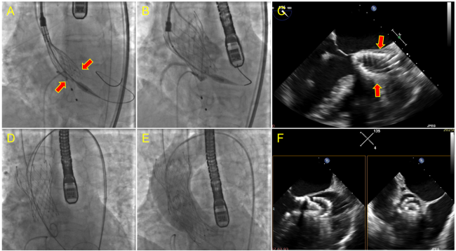 During the deployment, subvalvular stent compression was observed (Figure A). After the valve was deployed (Figure B), transesophageal echocardiogram (TEE) showed an olive-shaped deformation (Figure C). Immediately after the catheter delivery system was withdrawn, the valve migrated into the ascending aorta (Figure D). Subsequently, we decided to adopt a valve-in-valve (ViV) strategy, and the second valve (a Venus A23) was progressively deployed to achieve a tandem configuration with the first valve (Figure E and F). Both the left and right coronary artery ostia remained unobstructed, and only mild aortic regurgitation was noted.