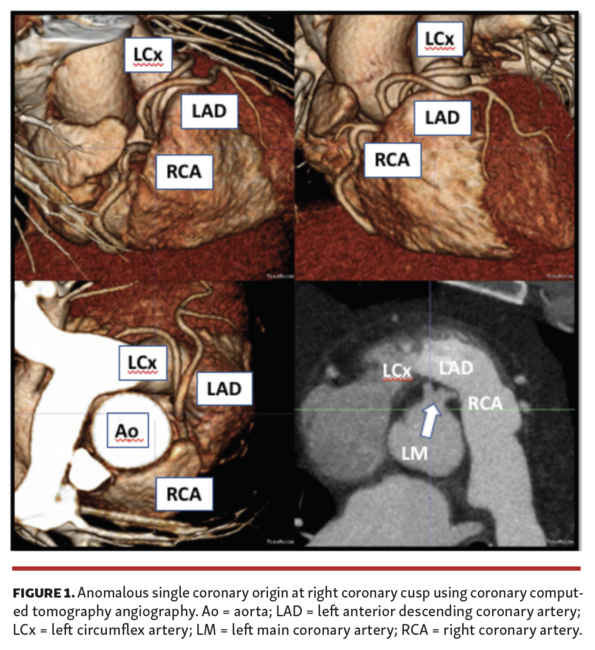 Ischemic work-up is important in this group of patients, with coronary angiography being the gold standard. As demonstrated here, CCTA is an essential tool to define artery course and provide further risk stratification. SCAs were originally classified by Lipton et al based on the site of origin and subtypes of anatomical distribution. Some subtypes are higher risk for SCA, especially during exercise due to the artery coursing between the aorta and pulmonary artery. Prepulmonic course is generally associated with a benign course.