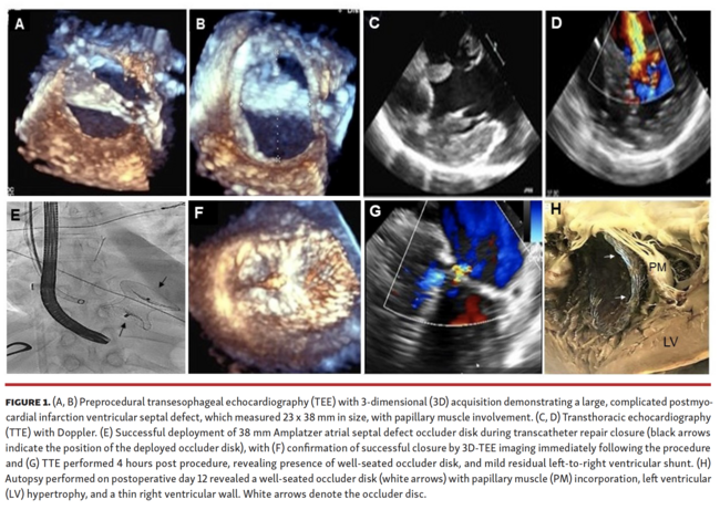 One of the most dreaded complications following myocardial infarction (MI) involves the rupture of infarcted myocardial tissue, often resulting in devastating structural defects, left-to-right shunting, subsequent biventricular failure, and onset of cardiogenic shock. In the absence of reperfusion therapy, the incidence of post-MI ventricular septal defect (VSD) occurs in approximately 1% of patients with ST-elevation MI and in 0.2%-0.34% of patients who receive fibrinolytic therapy.1 Diagnosis of post-MI VSD typically constitutes a surgical emergency; however, the exact timing of intervention relies on several factors in those patients who are considered surgical candidates.2,3 For those deemed too unstable or medically complex to undergo an invasive approach to repair, early case reports suggest feasibility of transcatheter repair with similar postprocedure outcomes.4,5 As transcatheter strategies for repairing complex structural defects become more widely utilized, more research is needed to assess safety and feasibility of this approach in high surgical risk patients with complicated structural defects.