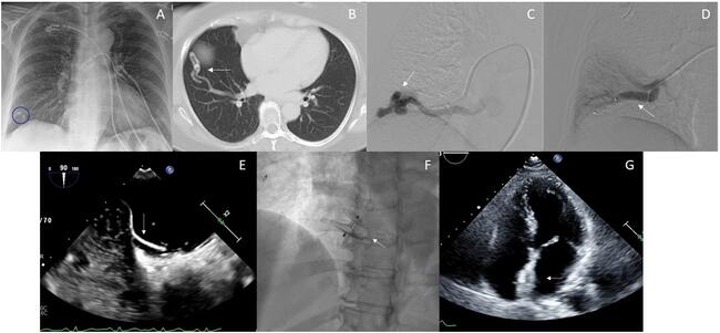 The patient underwent pulmonary angiography, which demonstrated a simple AVM arising from a branch of the RLL pulmonary artery (Figure C), with subsequent embolization. Via a 10F femoral venous sheath, the pulmonary arterial system was catheterized using a 7F guide catheter and 4F Glidecath (Terumo). A 12-mm Amplatzer AVP II plug (Abbott) was inserted for embolization (Figure D). Repeat TTE continued to show bubbles in the left atrium. A transesophageal echocardiogram revealed a patent foramen ovale (PFO) with atrial septal aneurysm (Figure E). The patient was referred for concomitant PFO closure. A 6F multipurpose guide catheter was advanced across the PFO into the pulmonary vein. An 8F Amplatzer intravascular delivery system was subsequently advanced across the inter-atrial septum over a stiff wire, and a 30-mm Amplatzer PFO Occluder (Abbott) was deployed and released (Figure F) utilizing intracardiac echocardiography guidance. Repeat TTE (Figure G) and CT demonstrated the absence of bubbles in the left atrium and complete occlusion of the pulmonary AVM, respectively.