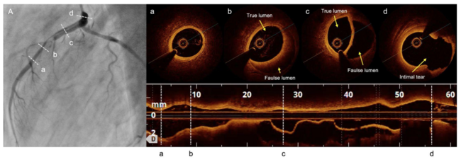 Figure a-d. Optical coherence tomography (OCT) images, a. No coronary artery dissection was found at the distal of LAD, b, c. OCT revealed coronary artery dissection corresponding to the CAG findings, d. Entry of the coronary artery dissection.