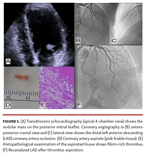 A 46-year-old woman with no significant past history presented to the emergency department with history of sudden-onset central chest discomfort and diaphoresis. Her electrocardiogram was suggestive of acute anterior-wall myocardial infarction (MI). Transthoracic echocardiography revealed apical hypokinesia and a hyperechoic nodular mass with irregular borders on the ventricular aspect of the posterior mitral valve leaflet (Figure 1). She had significant troponin I elevation.