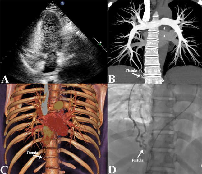 PAVF is a rare congenital vascular malformation that primarily manifests as dyspnea, migraine, ischemic stroke, hemoptysis, and nervous system complications.1 It may cause life-threatening complications, including stroke, hypoxemia, pulmonary hemorrhage, brain abscesses, and paradoxical emboli, so prompt diagnosis and treatment are crucial. Transthoracic contrast echocardiography has been recommended for screening PAVF.2 CTPA and pulmonary angiography are the recommended gold standard for detecting a PAVF.3 The transcatheter embolization of a PAVF is essential to prevent serious complications and improve the prognosis of the patient.