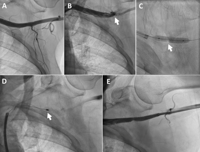 An 88-year-old man with severe symptomatic aortic stenosis (AS), renal failure, and peripheral vascular disease underwent transaxillary TAVR. A 14-French (Fr) sheath was used for the procedure. Following sheath removal, the patient developed a critical stenosis at the access site in the left axillary artery, caused by the sutures of the Perclose ProStyle VCD (Abbott) (Figure 1, Video 1). Balloon dilation failed to dilate the stenosis. The occlusive sutures were ablated using rotational atherectomy via transfemoral access using a 2.0-mm burr (Video 2). Subsequently, an 8 x 60-mm Fluency stent graft (BD) was implanted, and blood flow was restored (Video 3).