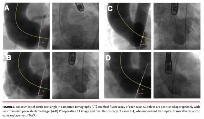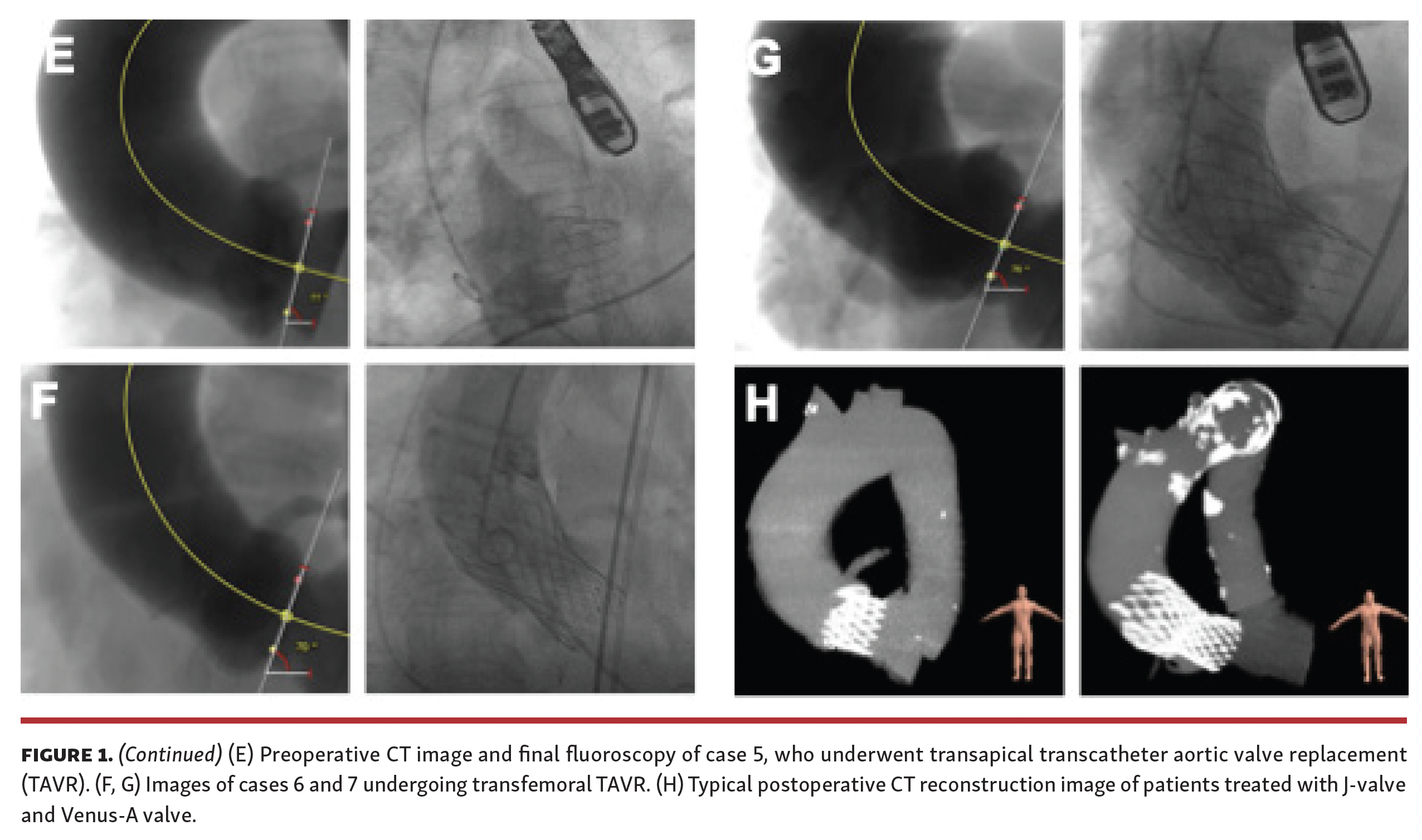 Transcatheter aortic valve replacement (TAVR) is not the preferred therapy for pure aortic regurgitation (AR). Extremely horizontal aorta (aorta root angle ≥70°) is regarded as an “off-label” use in self-expanding TAVR. This case series enrolled 7 consecutive pure AR patients who had extremely horizontal aorta and underwent self-expanding TAVR from the TORCH registry (NCT02803294). The mean age was 74.1 ± 8.3 years and the Society of Thoracic Surgeons (STS) score was 3.8 ± 1.5%. All patients lacked calcification at the aortic root. Transapical TAVR with a J-valve (Jiecheng) was performed in 5 patients and transfemoral TAVR with a Venus-A valve (Medtech) was performed in 2 patients (Figure 1 Part 1 and Figure 1 Part 2).