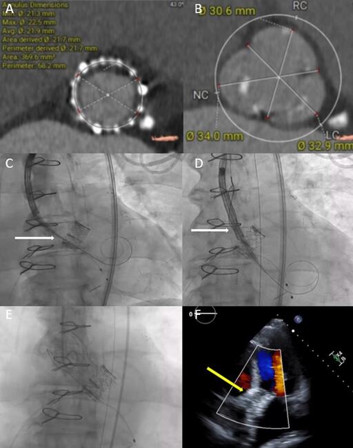 An 82-year-old man with a prior history of transcatheter aortic valve replacement (TAVR) with a 23-mm balloon-expandable transcatheter heart valve (THV) presented with bioprosthetic stenosis. Preoperative computed tomography revealed an underexpanded THV (Figure, A) with large sinuses with no risk for coronary obstruction (Figure, B). Hence, we decided to use a 26-mm self-expandable THV (Evolut FX 26 mm, Medtronic) to optimize hemodynamics for redo-TAVR.