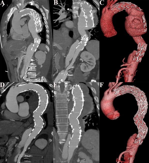 The patient underwent re-TEVAR with 2 Valiant thoracic stent grafts (Medtronic) measuring 32 x 28 x 150 mm and 36 x 36 x 200 mm. Postoperative CTA and aortic angiography confirmed a successful repair of the dSINE and endoleak (Figure D-F, Video 2). The postoperative course was uneventful, and he was discharged after 7 days. At the 12-month postoperative follow-up, no migration, deformation, or new endovascular leakage were observed.