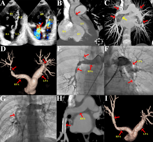 Laboratory examination was unremarkable. Electrocardiogram revealed bilateral ventricular hypertrophy and a prolonged QT interval. Transthoracic echocardiography showed right heart enlargement, severe tricuspid regurgitation, and an estimated main pulmonary artery (PA) pressure of 67 mm Hg (Figure A). Computed tomography angiography (CTA) revealed mild supravalvular aortic stenosis (Figure B), bilateral multiple peripheral PA stenosis and occlusion, and right superior pulmonary vein occlusion (Figure C and D). Pulmonary angiography revealed that the right middle and superior pulmonary arteries were occluded, and the right inferior pulmonary artery (RIPA) was severely stenotic with a pressure gradient of 63 mm Hg (Figure E; Video S1). Additionally, there was left PA trunk dilatation and left inferior PA stenosis (Figure F; Video S2). Right heart catheterization revealed an elevated central PA pressure of 53 mm Hg. Transcatheter RIPA stenting was performed using an 8 mm x 29-mm Omnilink Elite stent (Abbott) (Figure G; Video S3); the pressure of the RIPA decreased to 26 mm Hg.