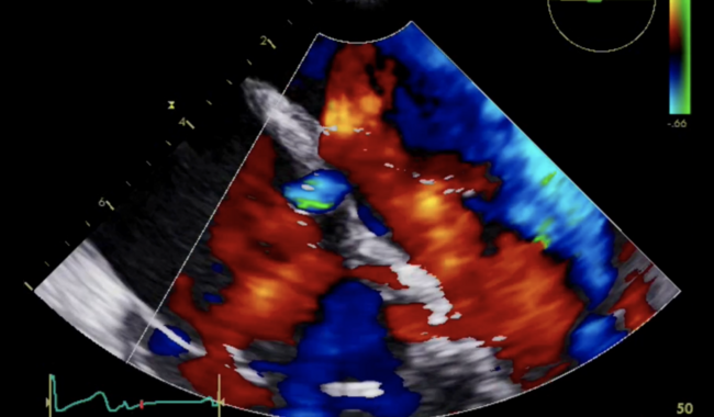 A 52-year-old woman with no known cardiac history developed infective endocarditis of the mitral and tricuspid valves caused by methicillin-sensitive Staphylococcus aureus following skin infection. She demonstrated complete heart block and severe mitral regurgitation (perforation in the anterior leaflet), moderate tricuspid regurgitation with vegetation at the base of the septal leaflet, and a shunt (left-right) from the left ventricle to the right atrium (Figure 1 and Video Series). At surgery, we debrided the mitral and tricuspid valves, and replaced them with tissue prosthetic valves. The inlet of the defect was confirmed to be immediately behind the A2 mitral leaflet. In the right atrium, we identified the shunting defect just in front of the anterior-septum commissure connecting to perimembranous septum (Figure 1). Infective tissue was also observed surrounding the outlet of the defect and was debrided. The defect was closed with autologous pericardium. Postoperative echocardiographic findings were satisfactory without residual shunt flow or perivalvular leak (Video Series). Postoperative recovery was uneventful without infection recurrence. Gerbode defect is a rare complication of infective endocarditis and careful preoperative echocardiographic work-up is imperative for successful repair.