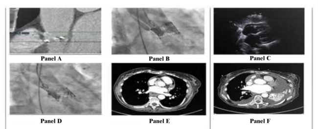 A 78-year-old woman with a background of hypertension and osteoarthritis presented with a history of syncope secondary to severe aortic stenosis. She underwent a computed tomography (CT) scan that showed a heavily calcific trileaflet aortic valve (Panel A). Her aortic annulus was measured at 445 mm2 with relatively modest aortic wall calcification. Following Heart Team discussion, she underwent a transfemoral transcatheter aortic valve implantation. A 26 mm Sapien S3 Ultra valve (Edwards Lifesciences) was deployed under rapid pacing. The patient reported chest pain extending to her back associated with a drop of blood pressure to 78/50 mm Hg. A check aortogram revealed an acute aortic dissection starting from the top frame of the transcatheter heart valve (Panel B). An echocardiogram revealed 0.8 cm of pericardial effusion with no evidence of right ventricular diastolic compromise (Panel C). In preparation for emergency open aortic repair, the patient became hemodynamically stable with no further chest pain. A repeat aortogram revealed that the dissection flap is no longer visible and likely to have sealed itself (Panel D). The patient was subsequently transferred for an urgent CT scan, which confirmed an ascending aortic dissection of 8.5 cm with no communication between the true and false lumen (Panel E). A conservative approach was elected, with the on-call cardiothoracic surgical team on standby if any change occurred in symptoms or hemodynamic, echocardiographic, or CT appearance. She was commenced on intravenous labetalol and was transitioned to oral antihypertensive, aiming for systolic blood pressure of less than 110 mm Hg. A repeat CT a few days later confirmed the dissection flap had not progressed (Panel F) and the patient was discharged home.