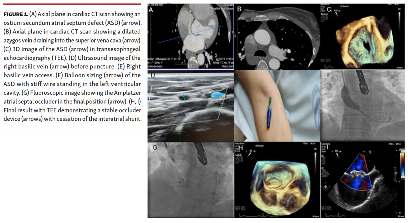 Atrial septal defect (ASD) closure is indicated in the presence of a significant left-to-right shunt. The preferable treatment is transcatheter closure, usually performed by transfemoral route. However, in the case of an interrupted inferior vena cava (IVC), the standard percutaneous approach can be troublesome. The authors report a case of a 55-year-old woman with an ostium secundum ASD with a significant left-to-right shunt at rest (Qp/Qs, 1.6). Her diagnosis and treatment are shown in Figure 1. The cardiac computed tomography scan showed an interrupted IVC above the renal veins. The patient was referred for percutaneous defect closure, through an ultrasound-guided right basilic vein access. The procedure was performed using transesophageal echocardiography guidance. A 7 Fr sizing balloon and Amplatzer TorqVue delivery system (Abbott) were introduced through the basilic vein. A 15 mm Amplatzer septal occluder device was used with a good final result.