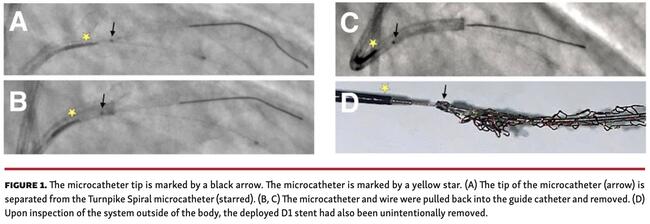 A follow-up angiogram at 6 weeks demonstrated patent LAD stents and a 90% ostial D1 lesion. Successful PCI was performed to the D1 with an excellent final angiographic result. To our knowledge, this is the first reported case of unintentional removal of a deployed stent due to a fracture of a microcatheter tip.
