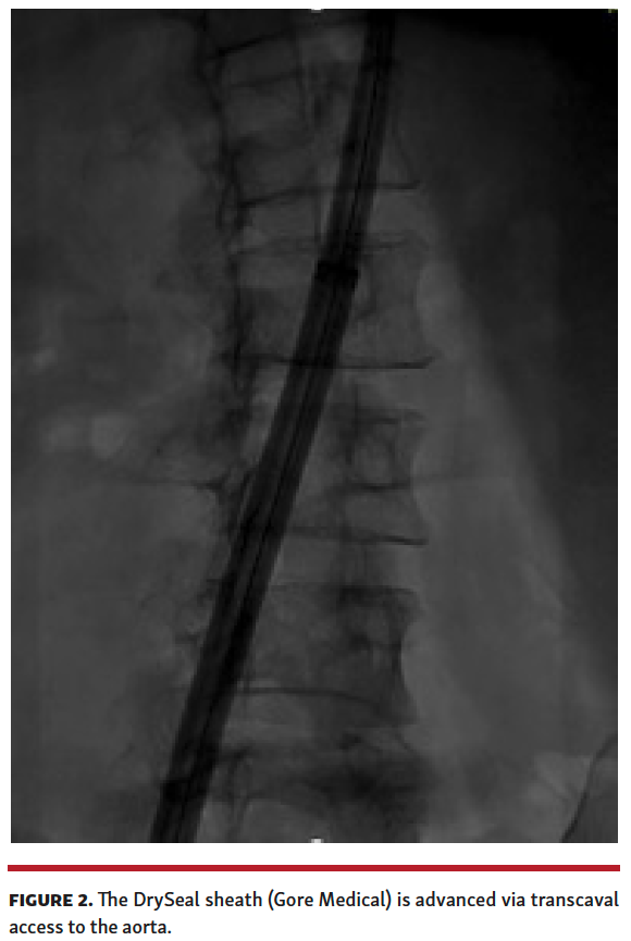 The patient’s iliofemoral and subclavian vessel size precluded percutaneous cannulation. We decided to perform transcaval aortic access to facilitate passage of a 26 Fr DrySeal cannula (Gore Medical).