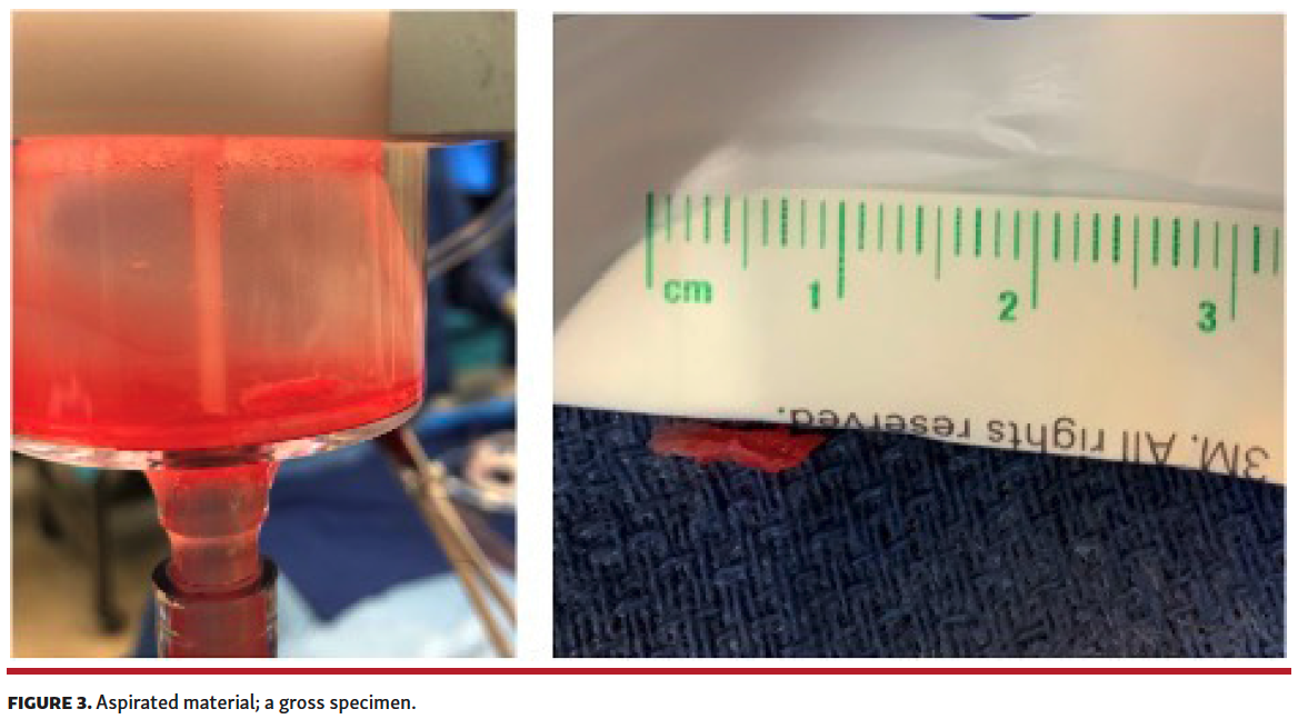 Given the proximity of the thrombus to the left subclavian, bilateral cerebral embolic protection was performed with 2 Sentinel cerebral embolic protection devices (Boston Scientific) (Figure 1). We then obtained transcaval access using standard technique (Figure 2) and a 26 Fr DrySeal sheath was placed across the retroperitoneum into the abdominal aorta. A 17 Fr cannula (Edwards Lifesciences) was placed into the contralateral vein to serve as the AngioVac return cannula. A 180° Gen 3 AngioVac catheter was then prepped in standard fashion and advanced through the 26 Fr DrySeal sheath; it was then engaged with transesophageal echocardiography guidance in the aortic thrombus, and the mobile part was successfully aspirated (Figure 3 and Video 2) with small residual clot that was adherent to the aortic wall (Video 3). The patient was discharged on therapeutic warfarin.