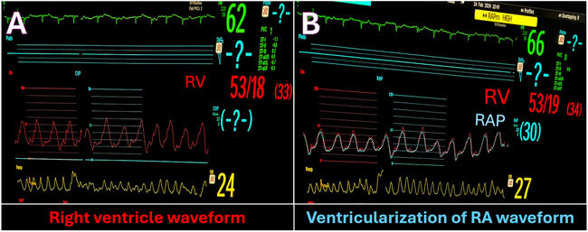 The patient was taken up for a coronary angiography with right heart catheterization. There was significant disease in the mid-left anterior descending artery and mild in-stent restenosis in the OMM and patent RCA stents. The catheterization study revealed a high RV end-diastolic pressure (EDP) of 18 mm Hg (normal: 1-7 mm Hg) and elevated right atrial (RA) pressures (mean RA pressure: 30 mm Hg) (Figure). The RA pressure trace had large V waves (53 mm Hg), and the prominent Y descent and RA trace resembled RV trace, characteristically known as ventriculization of RA pressure. The RV angiogram revealed grade 4 TR (Video). There was moderate pulmonary arterial hypertension (PA systolic pressure: 49 mm Hg; diastolic pressure: 27 mm Hg; and mean PA pressure: 38 mm Hg) and the left ventricle EDP was 9 mm Hg. The final diagnosis was right heart failure secondary to type 3 pulmonary hypertension. The patient was planned for medical management and doing well on diuretics.