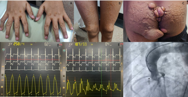 A teenage boy presented with multiple episodes of exertional syncope over the previous 3 months. Clinical examination revealed pulsus parvus et tardus and a late-peaking, ejection systolic, crescendo-decrescendo murmur in the aortic area with radiation to the carotids. There were visible tendon and intertriginous xanthomas on the hands (Figure A), tendon and eruptive xanthomas on the knees (Figure B), and tuberous xanthomas on the buttocks (Figure C). Twelve-lead electrocardiogram was suggestive of normal sinus rhythm with left axis deviation and left ventricular hypertrophy.