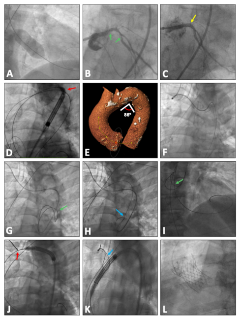 Through the right radial artery, a pigtail catheter was advanced over an angled Radiofocus guidewire (Terumo) to the descending thoracic aorta (Figure F). The pigtail catheter was exchanged for a Judkins Right (JR) 4, 6-French (Fr) guiding catheter. An Exeter Snare ES-35mm (AndraTec GmbH) was deployed in the descending thoracic aorta through the JR 4 catheter (Figure G; Video). A 0.032-inch guidewire was advanced from the right femoral access and passed inside the deployed snare (Figure H). With an Amplatz Left (AL) 1 catheter also passed inside the snare, the aortic valve was crossed with a straight guidewire. The high-support Lunderquist guidewire was positioned in the left ventricle crossing through the snare (Figure I). The bioprosthesis was advanced to the area of maximum angulation of the aortic arch. The snare was positioned at the level of the proximal portion of the aortic arch. Performing continuous traction with the snare on the high-support guidewire, coaxialization of the whole system was achieved, allowing it to advance through the area of maximum angulation (Figure J). Then the snare was released and withdrawn toward the distal portion of the aortic arch (Figure K). The 34-mm Evolut PRO+ valve was deployed successfully (Figure L). Once the bioprosthesis was released from the delivery system, the snare was inserted into the JR 4, 6-Fr guiding catheter and pulled out through the right radial artery.