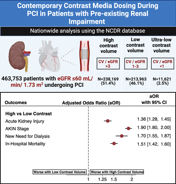 Our study builds upon prior work by reporting contemporary data across the United States using updated definitions and limiting the inclusion criteria to patients with the highest risk of developing contrast-associated AKI (ie, patients with pre-existing moderate to severe renal impairment). Our data support using the contrast volume/eGFR ratio as a guide for contrast dosing and limiting the contrast volume to less than 3 times the eGFR. The observed high proportion of patients still receiving high contrast volume was surprising. Further studies should investigate the factors that explain persistent use of high contrast volume use during PCI.