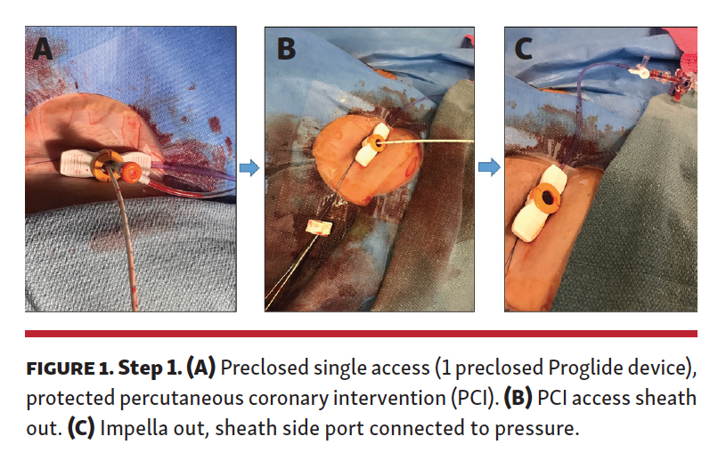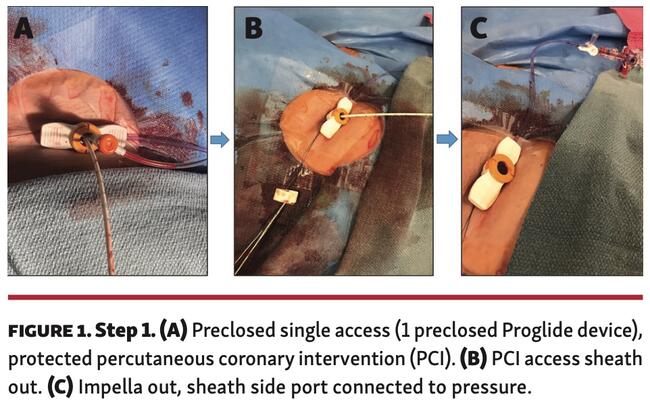 For that reason, we propose an alternative strategy, the “single access dry closure” technique, which provides vascular access control without the additional burden and risk of a second arterial access. If the SHiP technique consolidates two arterial access sites into one, to perform a high risk percutaneous coronary intervention (PCI) with Impella support, the "single access dry closure” technique consolidates 2 access sites into one for the purpose of dry field closure while allowing for bailout endovascular options for bleeding and other vascular complications.