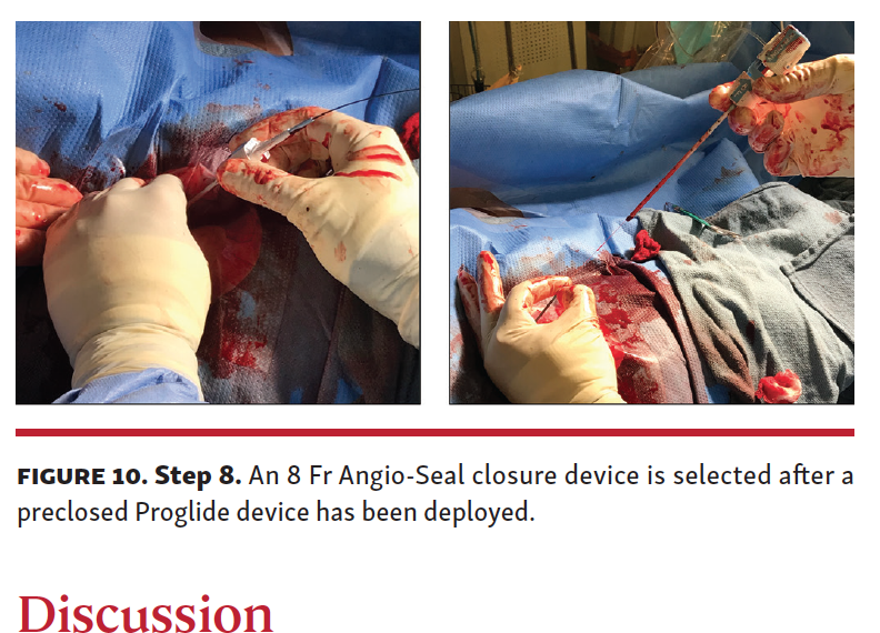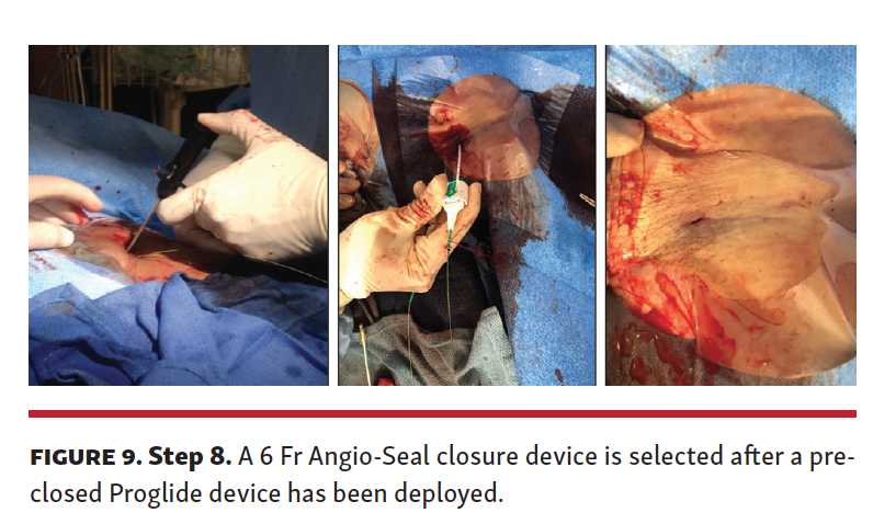 Step 8. If moderate oozing or pulsatile bleeding is noted after step 6, manual pressure or a second closure device will be necessary. Options for a second closure device include 6 Fr Angio-Seal (Figure 9), 8 Fr Angio-Seal (Figure 10), 6 Fr Mynx (Figure 11) or another Proglide,7 depending on operator experience and common femoral artery anatomy, with the goal of achieving adequate hemostasis.