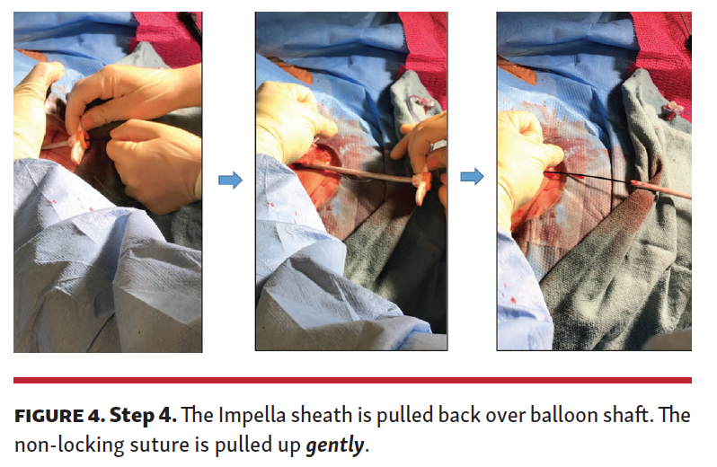 Step 3. The non-locking suture of the Proglide device is pulled, and the knot is gently advanced down to around the large-bore sheath without tightening or locking to avoid sheath/balloon entrapment (Figure 3).
