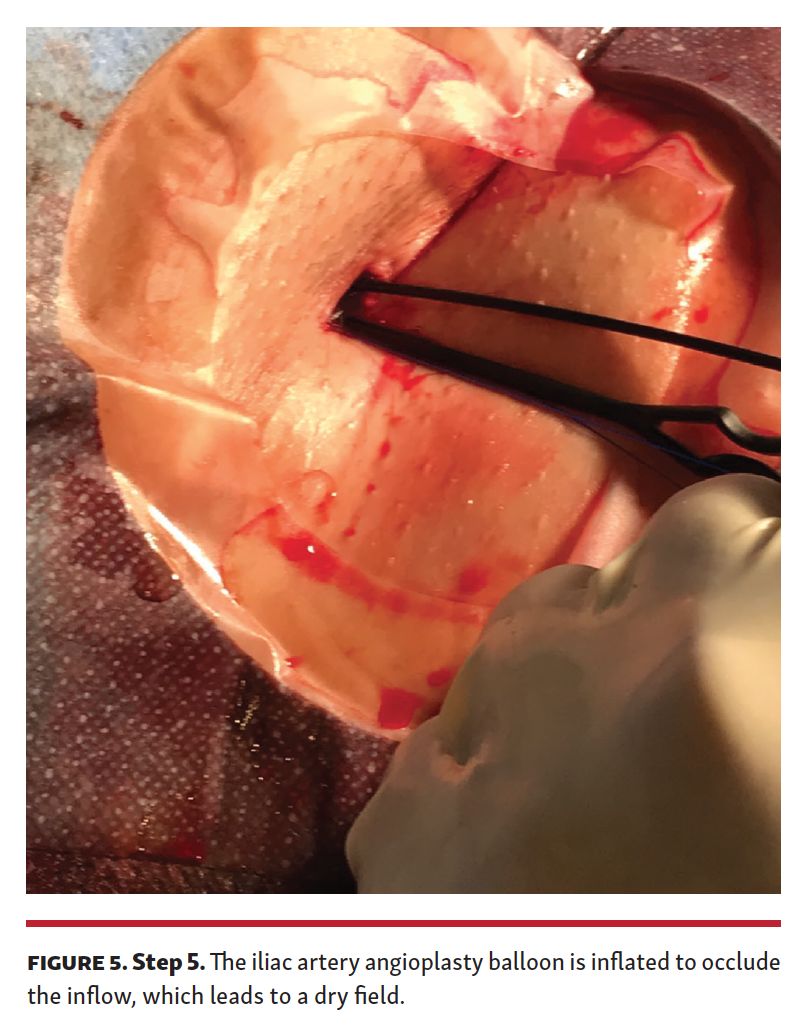 Step 5. The Proglide suture knot is gently pushed down, without tightening it, on the balloon shaft to avoid entrapment. The field should be dry without manual pressure, while the iliac balloon is inflated (Figure 5).