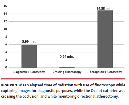 A total of 19 patients participated in this pilot phase of the HIPACT study; they were predominantly male (67%) with a mean age of 72 ± 11.6 years. The CTO lesions were primarily (67%) in the superficial femoral artery (SFA), with 4 in a popliteal artery, and 1 each in the tibial peroneal trunk and the common iliac artery. All obstructions were crossed successfully by the crossing catheter with no dissections or perforations. Directional atherectomy reduced the obstructions such that blood flow was restored through the area of the obstruction, as determined by angiography. The amount of fluoroscopy time varied with the device used, with less than a minute of time (14 seconds) needed when the OCT-guided catheter was advanced through the obstruction to prepare a path for the atherectomy device (Figure 3).