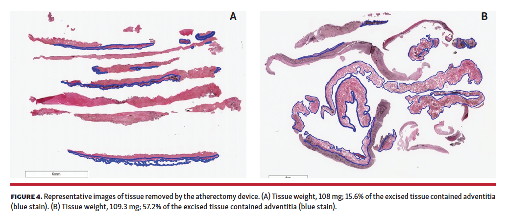 Study limitations. This study is limited by its small sample size and limited tissue sampling, since this was our first experience with histopathologic assessment, but it was a pilot phase of a study that will build on what was determined with the analyses. To further consolidate our findings, a more detailed assessment in a larger patient population is needed. In addition, with the advancement of OCT imaging capacity being incorporated into directional atherectomy catheters, a more refined and guided intravascular imaging system may be a better option for future studies.29
