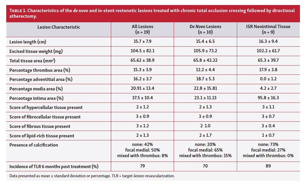 Lesion characteristics and histologic assessments are provided in Table 1. Lesion lengths ranged from 8-36 cm (mean, 15.7 ± 7.3 cm) and resected tissue weighed 27.9-310 mg (mean, 104.5 ± 76 mg) with a mean total tissue area of 65.62 ± 41.3 mm2. Ten of the lesions were de novo and 9 were in-stent restenosis (ISR) in origin. The de novo lesions were shorter (mean length, 15.4 ± 6.5 cm vs 16.4 ± 9.4 cm; P=.10) and bulkier (mean tissue weight, 105.9 ± 73.2 mg vs 102.2 ± 68.3 mg; P=.90) in comparison with the ISR neointimal hyperplastic tissue.