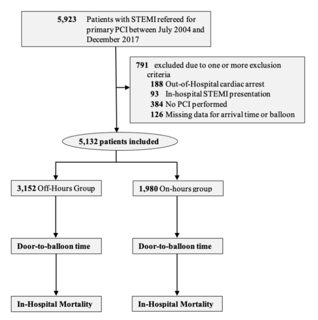 In the study by Latucca et al, a total of 2167 STEMI patients were evaluated who were referred for primary PCI.16 The median first medical contact-to-sheath insertion time did not differ between off-hours and on-hours admission (93 minutes vs 90 minutes; P=.58); given the minimal difference in these critical time intervals, it is not surprising that there was no difference in the in-hospital mortality. Of note, patients with out-of-hospital cardiac arrest were included, which likely contributed to a higher overall in-hospital mortality rate in this study. The inclusion of patients with out-of-hospital cardiac arrest may attenuate the impact of door-to balloon time as the extent of acute brain injury has a dominant effect on survival in such patients where time to return of spontaneous circulation is likely more clinically relevant.