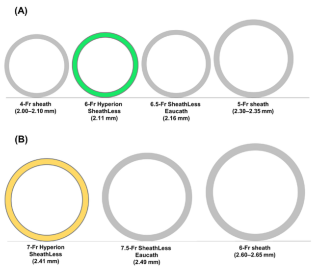 The 6-Fr Hyperion SheathLess guiding catheter combines an inner diameter of 1.80 mm, which is 6-Fr compatible, with an outer diameter of 2.11 mm, which is smaller than that of a 6.5-Fr Sheathless Eaucath guiding catheter (2.16 mm) or a 5-Fr sheath (2.30-2.35 mm) and is almost the same size as the 4-Fr sheath (2.00-2.10 mm), whereas the 7-Fr Hyperion SheathLess guiding catheter combines an inner diameter of 2.05 mm, which is 7-Fr compatible, with an outer diameter of 2.41 mm, which is smaller than that of a 7.5-Fr SheathLess Eaucath guiding catheter (2.49 mm) or a 6-Fr sheath (2.60-2.65 mm) (Figure 1).