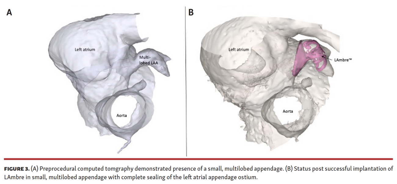 The left atrial appendage (LAA) is a highly variable anatomical structure, which may pose a challenge to successful LAA occlusion with currently approved technology.1 We present our experience with the compassionate use of the LAmbre LAA closure device (Lifetecha) for a 79-year-old male patient with non-valvular atrial fibrillation and multiple falls who was considered high risk for anticoagulation therapy. Computed tomography (CT) evaluation of the LAA measured 16.3 x 9.6 mm with a depth of 18.2 mm, which the implanting team felt was too small to accommodate a Watchman device (Boston Scientific). The Watchman FLX device was not available at the time. The patient agreed to participate in the compassionate use of the LAmbre device. Institutional review board approval was obtained.