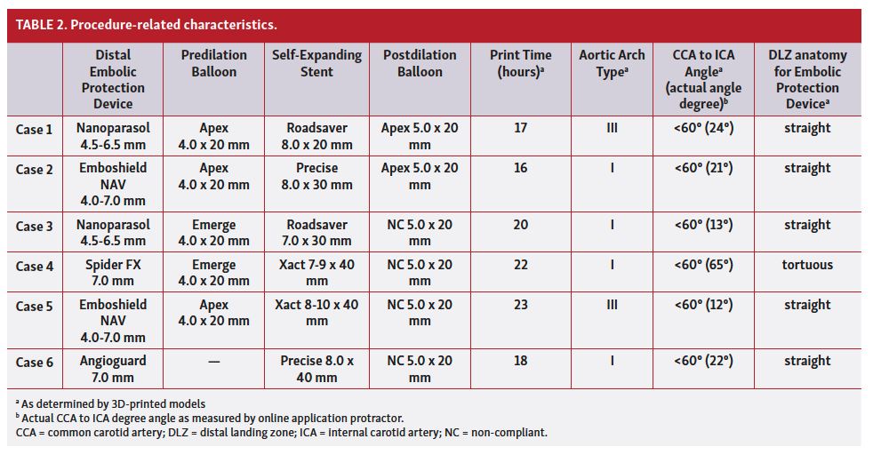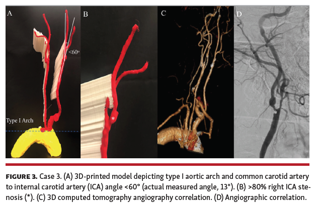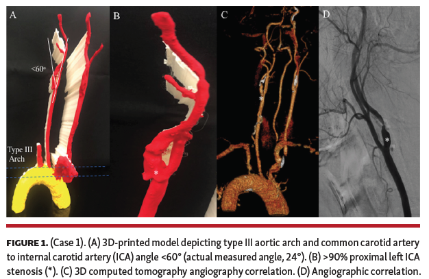 Carotid artery stenting (CAS) is associated with higher periprocedural and non-procedural ipsilateral stroke when compared with carotid endarterectomy (CEA).1 Etiology for this incidence is related to unfavorable aortic arch type, common carotid artery (CCA) to internal carotid artery (ICA) angulation, tortuous ICA distal landing zone (DLZ) for embolic protection device (EPD), plaque morphology, and other patient-related clinical factors. Computed tomographic angiography (CTA) of the aortic arch and carotid arteries with 3-dimensional (3D) reconstruction is a non-invasive, safe, reliable, and economically valuable imaging modality that can aid with periprocedural planning, although it has limitations. 3D-printed models (3D-PMs) of the aortic arch and carotid arteries from CTA can offer added value by allowing enhanced visual and perceptual understanding of complex anatomy and may reduce procedure-related adverse outcomes by allowing appropriate selection of access site, specific diagnostic and interventional catheters for intraprocedural navigation, better appreciation of arch and carotid tortuosity, and preprocedural stent and EPD sizing.