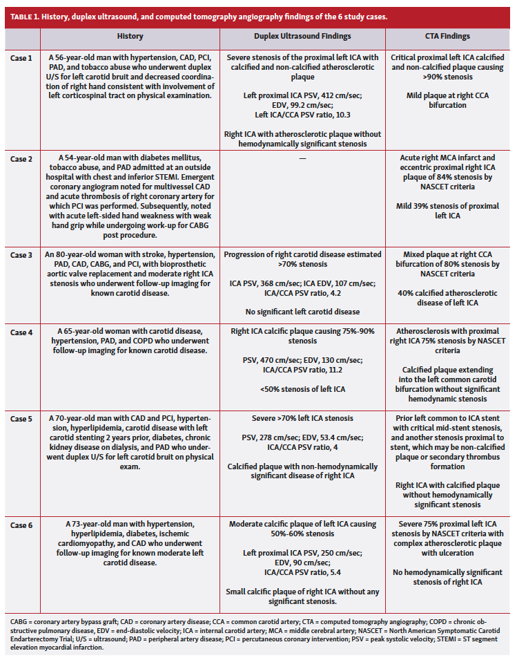 Comparison of imaging modalities for carotid disease. DUS is technician dependent and can be inaccurate in difficult anatomies, such as calcific lesions, tortuous arterial course, and “hairline” lumens, leading to overestimation of occlusion. Variable definition for stenosis percentage, which is institution and reader dependent, is another limiting factor.6 In comparison with DUS or CTA, limitations of preprocedural imaging with MRA include higher cost, patient discomfort (claustrophobia), or incompatibility due to metal implant. CTA has emerged to be more cost effective than MRA and with a higher accuracy than DUS. In a study of 30 patients for detection of degree of stenosis, dual-source CTA had a sensitivity of 100% and specificity of 97% vs MRA at 100% and 95%, respectively.7 Furthermore, in a comparative study of CTA vs conventional angiography in 53 patients, a sensitivity of 87% and specificity of 90% with an accuracy of 89% was seen in diagnosing carotid disease (NASCET [North American Symptomatic Carotid Endarterectomy Trial]criteria >60%) and plaque characterization (ulceration, fatty plaque, fibrosis, occlusion, and calcifications).8