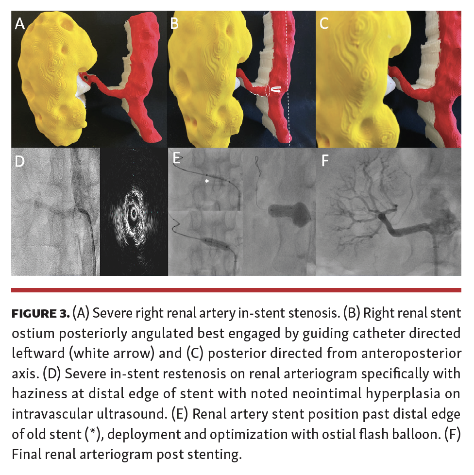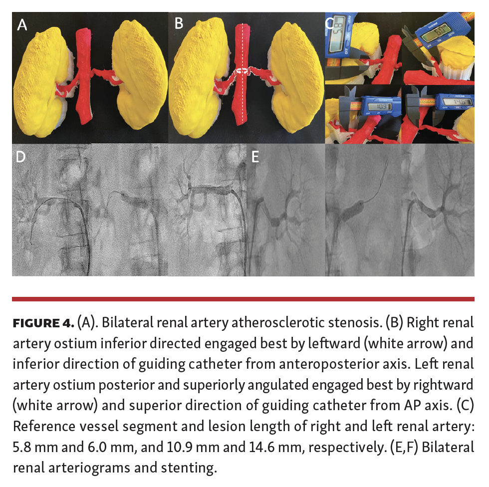 Hemodynamically significant renal artery stenosis (RAS) clinically manifests as uncontrolled refractory hypertension, deteriorating renal function from ischemic nephropathy, acute recurrent flash pulmonary edema, and/or acute coronary syndrome. In patients undergoing cardiac catheterization, prevalence of atherosclerotic RAS is between 25%-30%, and is additionally seen in 30%-40% of patients who have peripheral arterial disease or abdominal aortic aneurysm.1 Non-invasive imaging modalities for diagnosis are not without limitations. Renal artery to aorta peak systolic velocity ratio >3.5, measured on renal duplex ultrasound, has a 92% sensitivity for >60% diameter stenosis, but is limited by technician skills and patient body habitus.2,3 Abdominal computed tomography angiography (CTA) has a sensitivity and specificity for renal diameter stenosis >50% of 90%-100% and 97%, compared with 92-97% and 73%-93% for magnetic resonance angiography (MRA) respectively.3 An added benefit of MRA or CTA includes superior assessment of accessory vessels, differing renal branching patterns and vessel orientation. 3D reconstructed CTA (3D-CTA) goes a step further by allowing multidimensional complex anatomic visualization, but is still limited to a virtual image. The added value of 3D-printed models (3D-PMs) of renal artery pathology for renal artery interventions allows augmented stimulation of sensory, perceptual and tactile understanding of anatomy not provided by aforementioned imaging modalities.