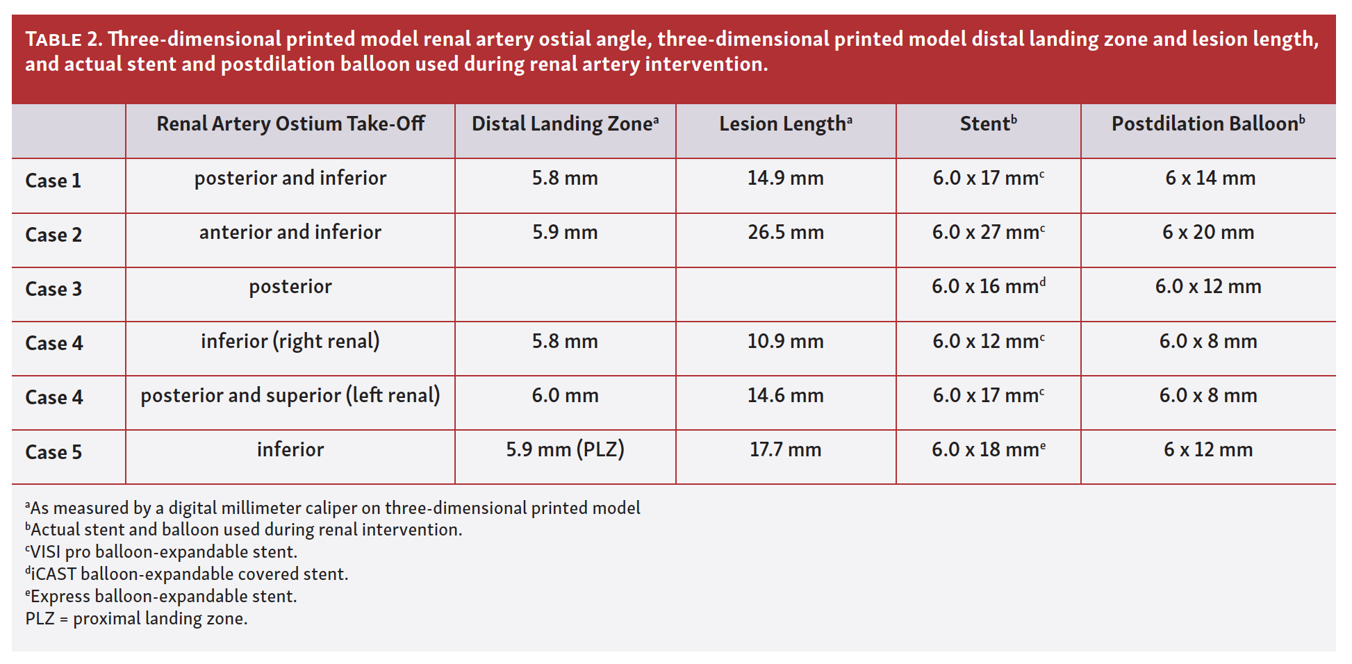 Clinical history, renal ultrasound and CTA of all 5 patients are described in Table 1. Diverse renal artery pathology including atherosclerotic RAS, fibromuscular dysplasia (FMD), in-stent restenosis (ISR), and bilateral RAS were included. The print time of the 3D-PM, on average, was between 6-7 hours. The 3D-PM and pathologic anatomy of each individual renal intervention case along with renal arteriogram correlation are described below. Clinically valuable information derived from the 3D-PM including renal artery ostium angle, 3D-PM reference vessel size (RVS), and lesion length measured by a digital millimeter (mm) caliper, along with actual stent and post-dilation balloon size used during procedure are listed in Table 2 and described below.