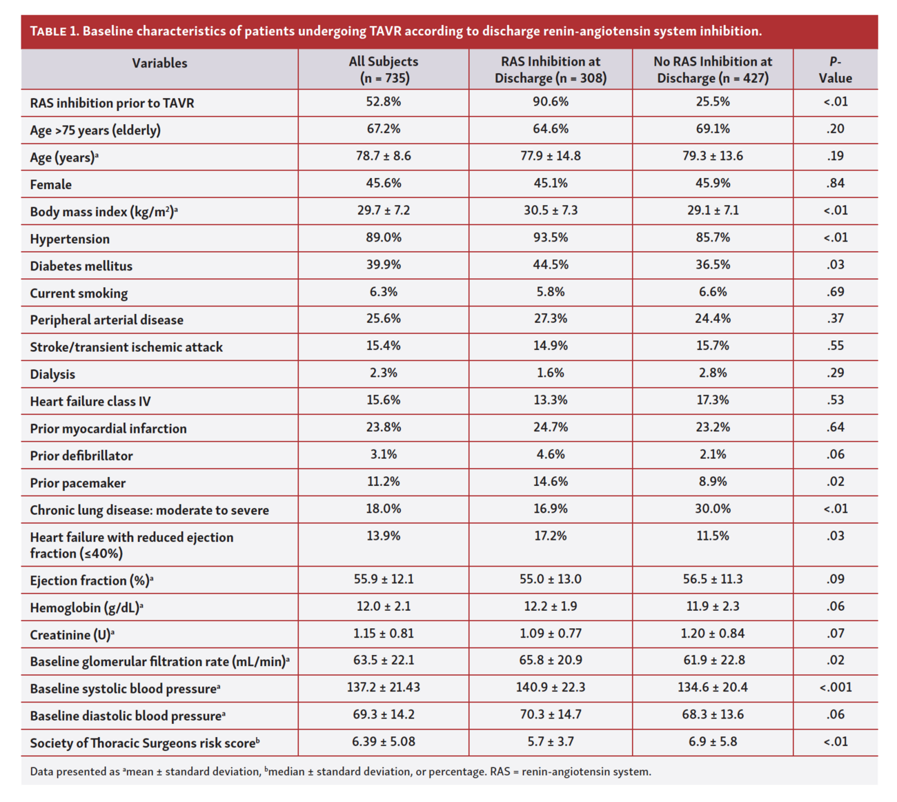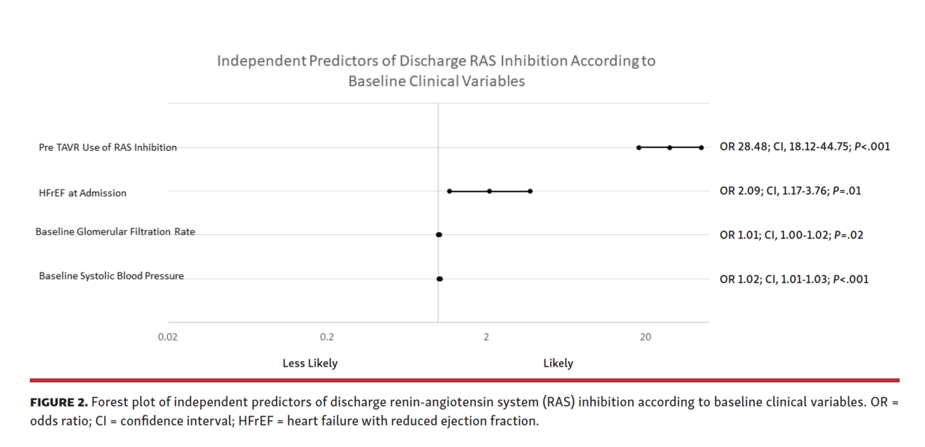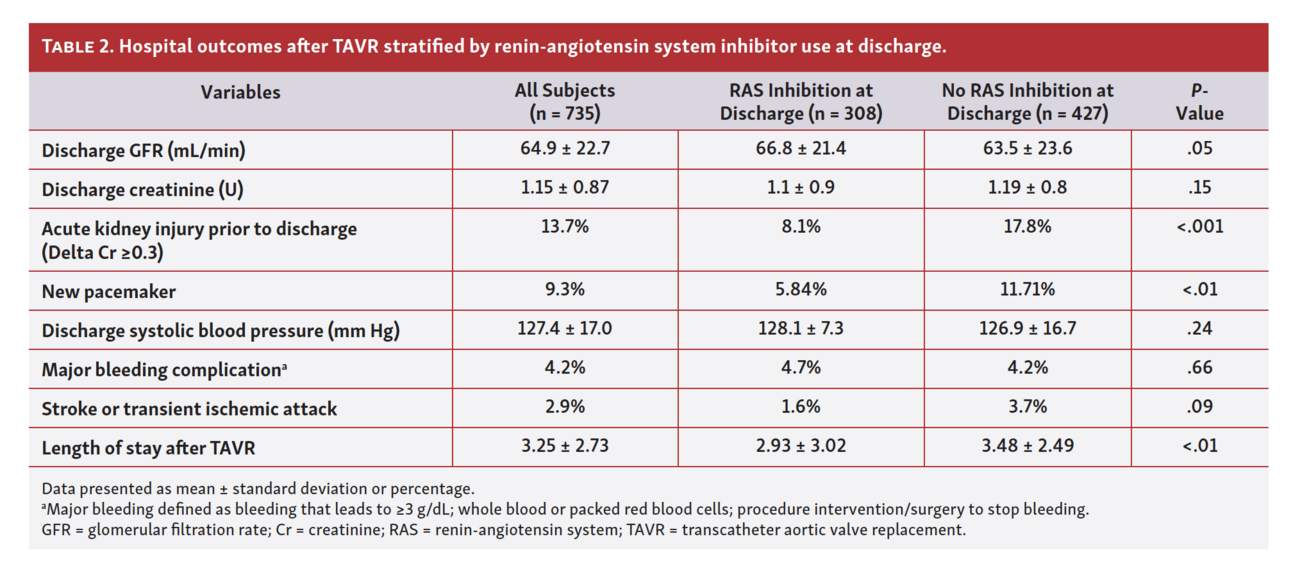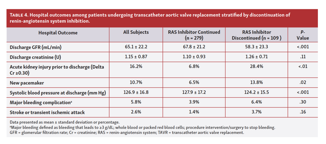 This single-center registry has 3 main observations: (1) only 42% of TAVR patients were discharged with RAS inhibitors; (2) the main predictors of RAS inhibitor utilization at discharge were RAS inhibitor use prior to TAVR, HFrEF, and higher systolic blood pressure — notably, AKI and new pacemaker requirement predicted lack of RAS inhibitor utilization; and (3) the main predictors of RAS inhibitor discontinuation were generally similar and again included AKI after TAVR as a major predictor of RAS discontinuation.