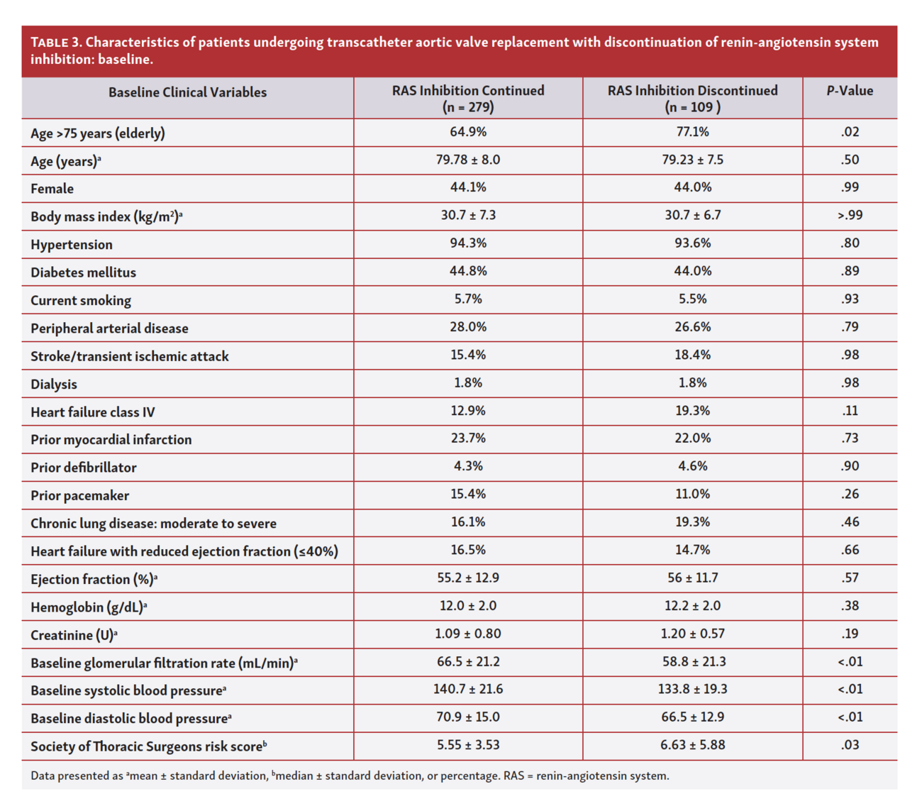 The two co-primary study endpoints were rates of RAS inhibition utilization at discharge and RAS inhibitor discontinuation prior to discharge. Predictors of these two endpoints were then identified by univariate and multivariable analyses. Variables were summarized using means, standard deviations, or percentages. Overall, group comparisons of baseline demographics and medical histories, baseline laboratory and medications, echocardiographic characteristics, and procedural characteristics were conducted. These measures were compared between patients with RAS inhibition vs those without RAS inhibition at discharge as well as between those with RAS inhibitor continuation vs discontinuation. Categorical variables were reported as percentages and compared using the Chi-square test for independence; continuous variables were reported as mean values and compared using the Wilcoxon rank-sum test. Multivariable models were generated using clinical and procedural variables with a P-value <.10.
