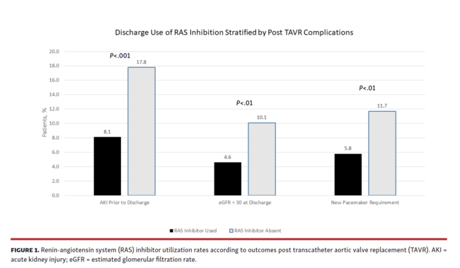 Transcatheter aortic valve replacement (TAVR) has positive effects on left ventricular (LV) function, including improvement in LV ejection fraction (EF), regression of LV hypertrophy, and reduction in myocardial fibrosis.1,2 However, LV improvement is not observed in up to one-third of patients post TAVR and persistent LV dysfunction has been associated with worse outcomes.2,3 Renin-angiotensin system (RAS) inhibitors have been extensively studied in patients with heart failure (HF) with reduced EF (HFrEF), but whether they are indicated post TAVR is unclear as prior RAS inhibitor trials did not include patients with aortic stenosis or TAVR procedures.4 Animal and human studies have shown that RAS inhibition in severe aortic stenosis can improve LV hypertrophy and myocardial fibrosis.5,6 Recent registry data suggest that patients undergoing TAVR may benefit from routine utilization of RAS inhibitors, with a significant decrease in 3-year mortality after TAVR associated with RAS inhibition.7 In another registry analysis of 15,896 TAVR patients, decreased HF readmission rates were associated with RAS inhibition.8 Barriers to the routine use of RAS inhibition in TAVR patients warrant further study. In the current study, we investigated the predictors of RAS inhibitor utilization at discharge after TAVR and in particular hypothesized that discharge use of RAS inhibition may be influenced by acute kidney injury (AKI) post TAVR.