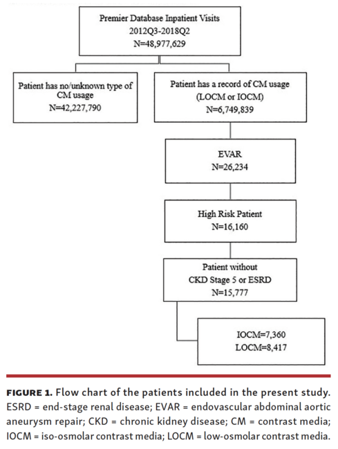 Approximately 45,000 abdominal aortic aneurysms (AAA) are diagnosed in the US population each year.1 As a minimally invasive alternative to traditional open repair, endovascular aneurysm repair (EVAR) for AAA has evolved into first-line treatment, predominately in the elective setting, and the procedure is increasingly used in the contemporary management of AAA patients. Between 2000 and 2010 EVAR increased from 5% to 74% of AAA repairs and is rapidly replacing open repair procedures.1 Patients undergoing EVAR frequently have comorbidities of diabetes, chronic kidney disease (CKD), congestive heart failure (CHF), and advanced age; therefore, they are at high risk of acute kidney injury (AKI) and adverse cardiac events. The diagnostic and interventional phases of endovascular AAA repair pose a risk for AKI as they require intra-arterial administration of iodinated contrast to facilitate aortography as well as manipulation of the peri-renal aorta increasing the risk for renal embolization or compromise of renal artery flow.2-5 A prior study found the rate of AKI in EVAR to be 13%,5 with some studies suggesting lower risk of AKI with EVAR as compared with open repair, and others studies showing no difference.3,4 The major adverse cardiovascular event (MACE) free survival rate was favorable in EVAR vs open procedures (30-day post EVAR 97.0% [95% CI, 96.4-97.5] vs open 90.8% [95% CI, 89.9-91.7]; 4 years after repair EVAR 72.9% [95% CI, 71.4-74.4] vs open 69.9% [95% CI, 68.3-71.3]).6