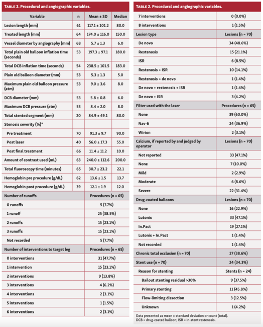 Table 1 shows the demographics of patients enrolled. A total of 56 patients (65 procedures, 70 lesions) were enrolled. The mean patient age was 70.9 ± 10 years, with 66.1% males, 48.2% diabetics, and 25% with limb ischemia. Table 2 shows the procedural and angiographic variables. Of the 70 lesions, 31.4% had severe calcification, 38.6% were chronic total occlusions, and 48.6% were de novo disease (in-stent restenosis in 28.6%). The majority of treated vessels were femoropopliteal (88.6%) and 29.2% had 2 or more prior interventions. Stenosis at baseline was 91.3 ± 9.7%, stenosis post laser was 56.0 ± 17.3%, and stenosis post final treatment was 11.4 ± 11.2%. Lesion length was 117.1 ± 101.2 mm and treated length was 174.0 ± 116.0 mm. Bailout stenting occurred in 11/70 lesions (15.7%). Post laser, there was no NHLBI class D dissection; post laser plus percutaneous transluminal angioplasty, there was 1 class D dissection. Drug-coated balloon (DCB) usage was 47.1% Lutonix (BD/Bard), 27.1% In.Pact (Boston Scientific), and 1.4% both. The details of the laser procedure are shown in Table 3.